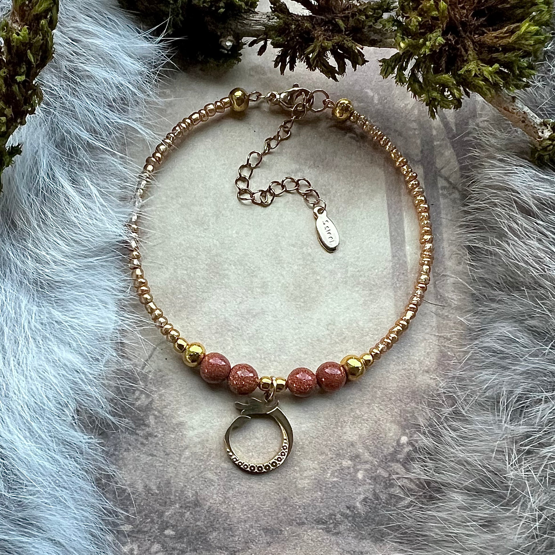 Armband med guldfärgade glaspärlor, guldsten och ormberlock i rostfritt stål.