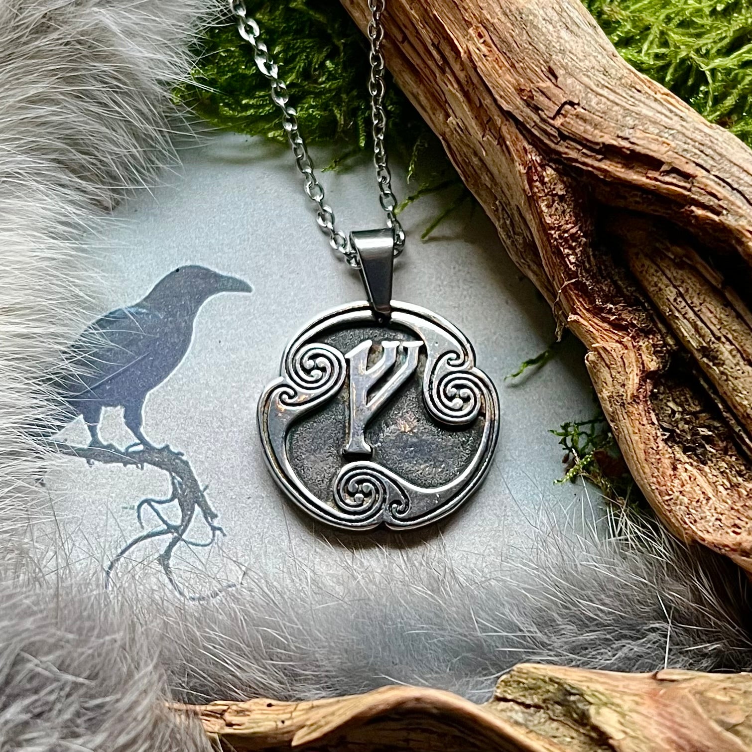 Vikingasmycke halsband helt i rostfritt stål med runa från den äldre futharken. Runalfabetet kallas futhark då namnet bildas av de sex första runorna i raden.