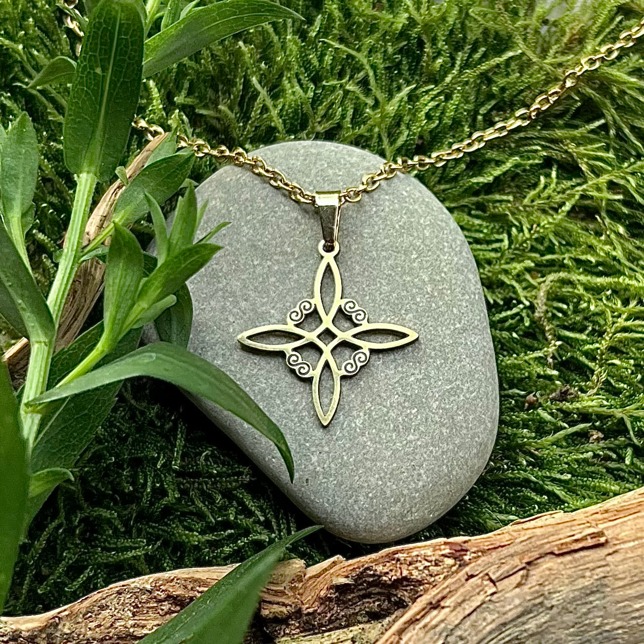 Halsband med keltisk lyckoknut/häxknut i guldfärgat, rostfritt stål