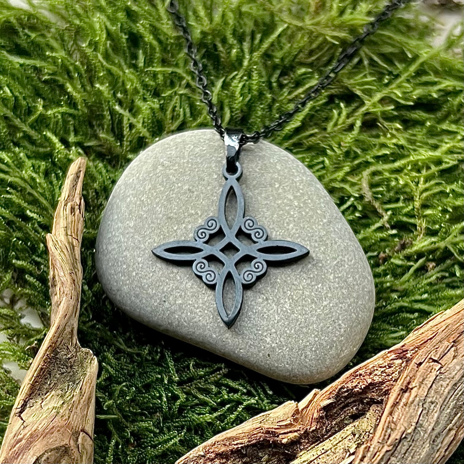 Halsband helt i svart, rostfritt stål med keltisk lyckoknut, även kallad häxknut.