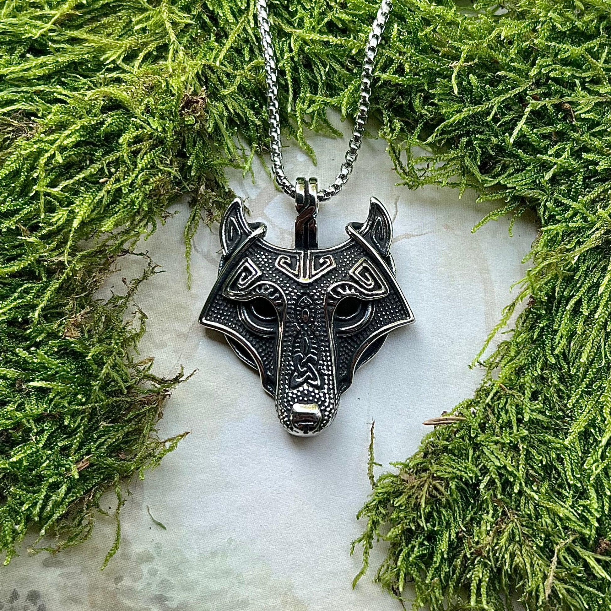 Halsband med varghuvud och keltiskt mönster av kirurgiskt stål. Detta hänget är lite mindre än våra populära varghuvuden med ögon av glas.