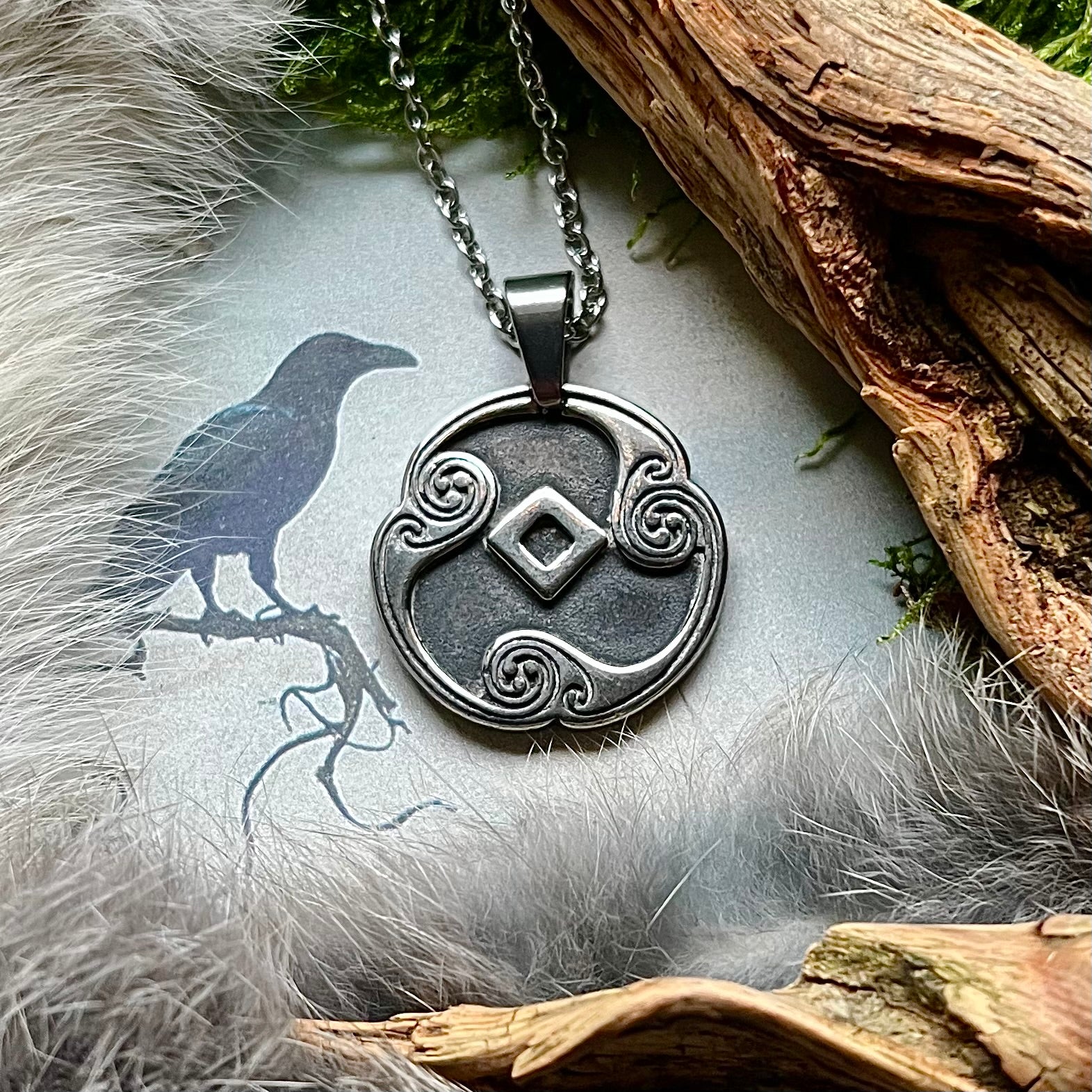 Vikingasmycke halsband helt i rostfritt stål med runa från den äldre futharken. Runalfabetet kallas futhark då namnet bildas av de sex första runorna i raden.