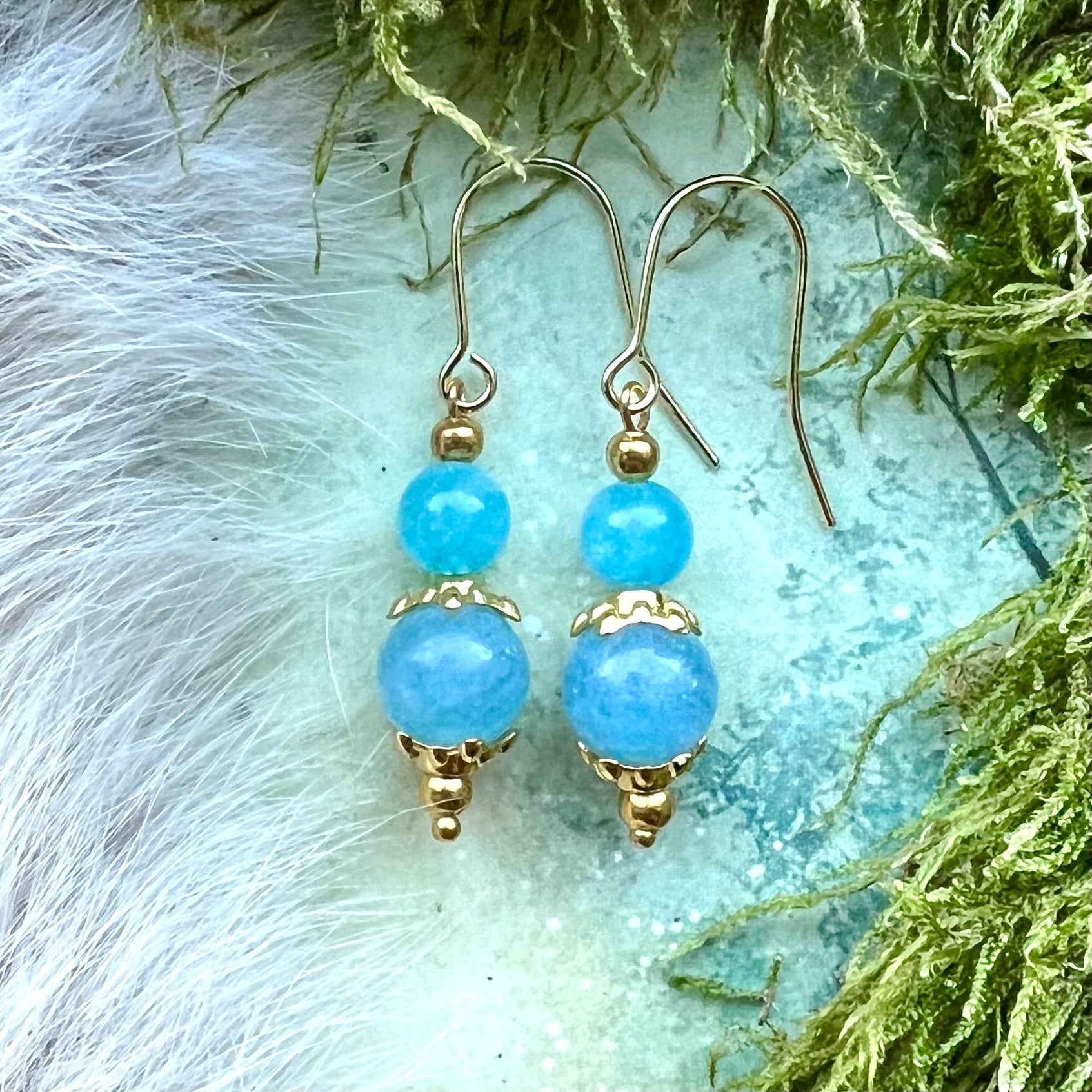 Örhängen med krok av guldfärgat kirurgiskt stål och pärlor av akvamarin.
