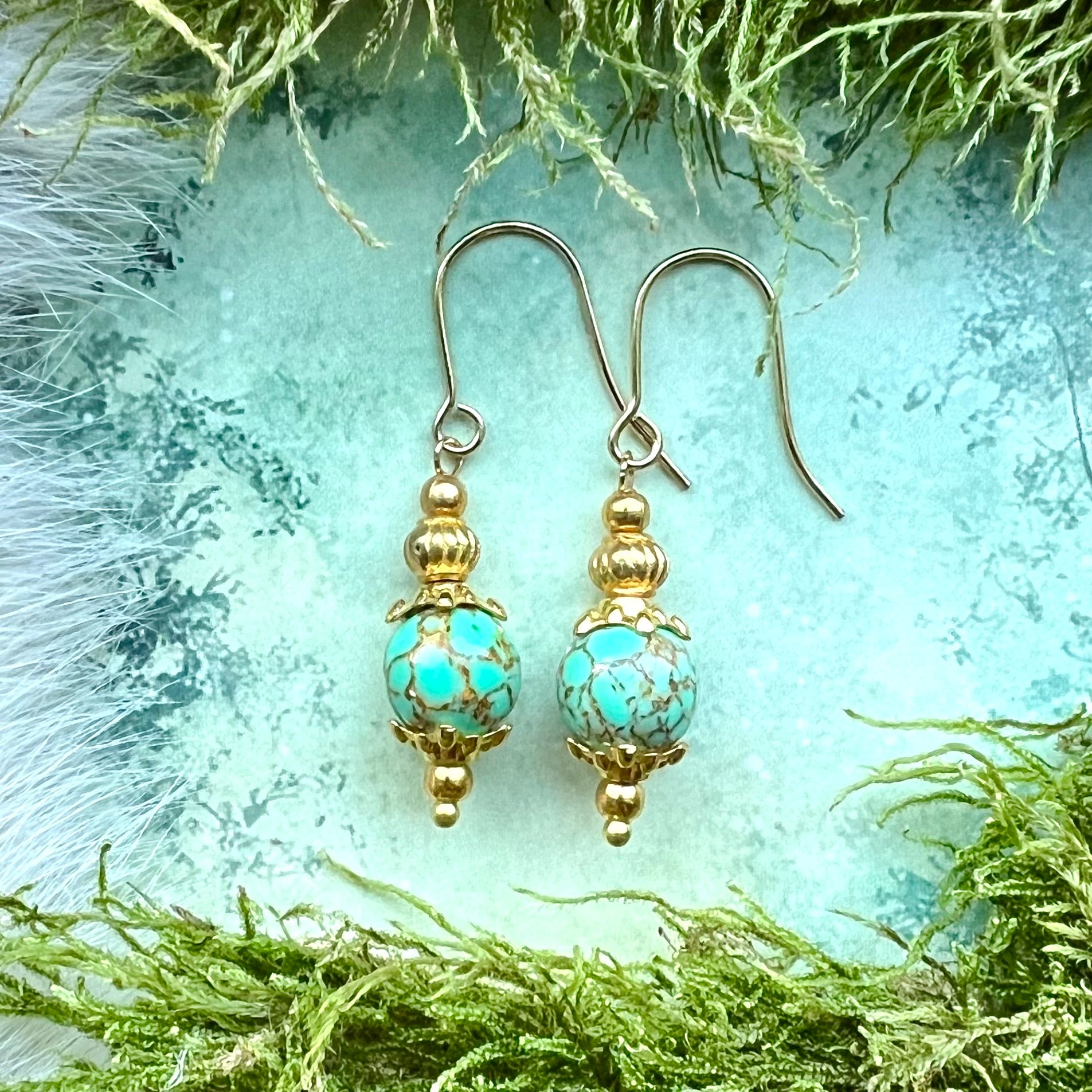 Örhängen med krok av guldfärgat kirurgiskt stål och pärlor av folierad turkos.
