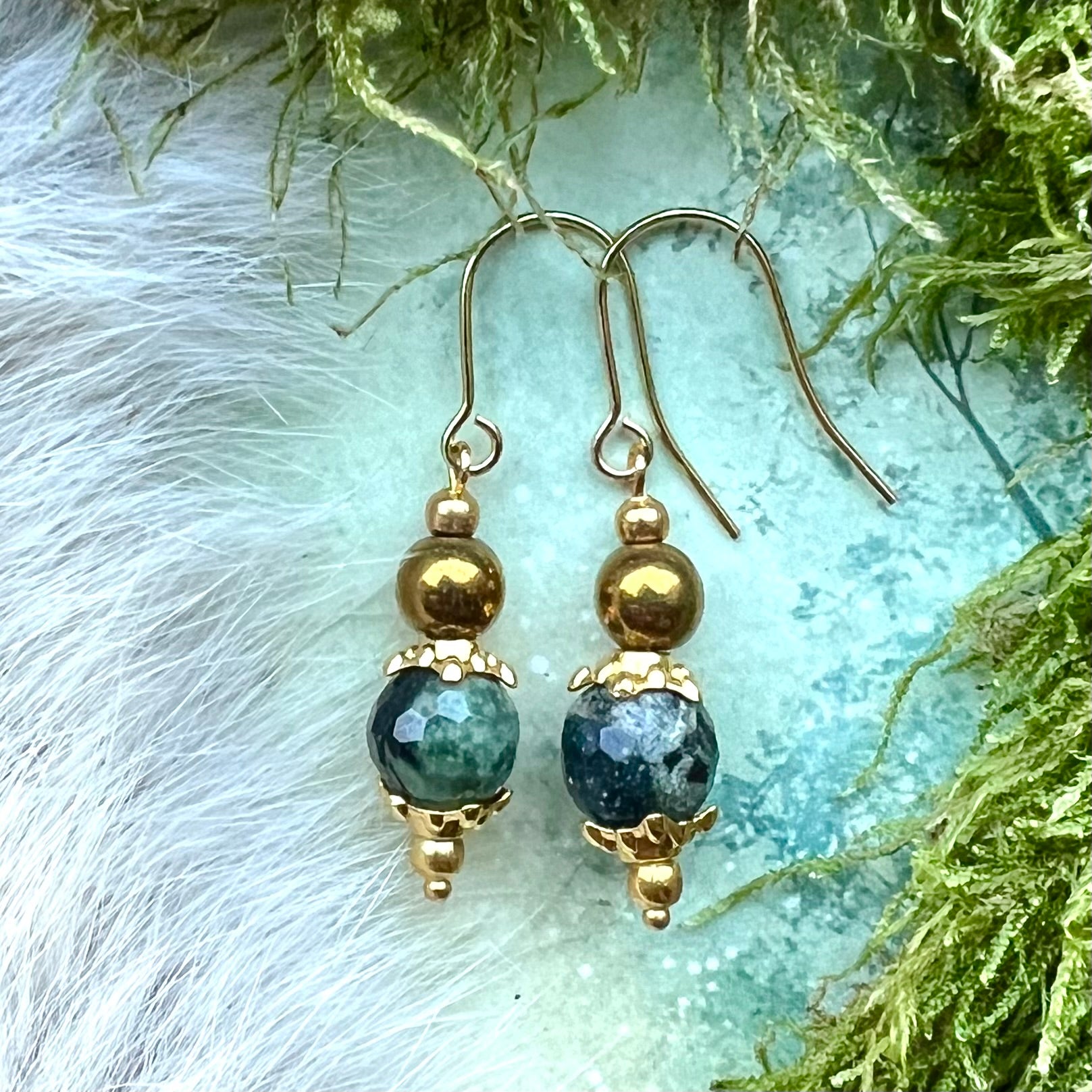 Örhängen med krok av guldfärgat kirurgiskt stål och pärlor av fasetterad kambabajaspis och färgad hematit.