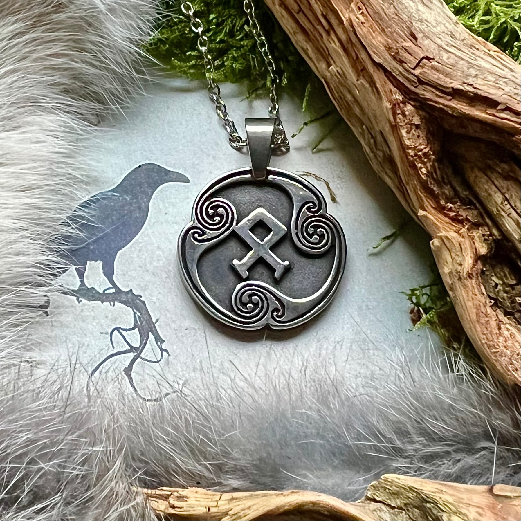 Vikingasmycke halsband helt i rostfritt stål med runa från den äldre futharken. Runalfabetet kallas futhark då namnet bildas av de sex första runorna i raden.