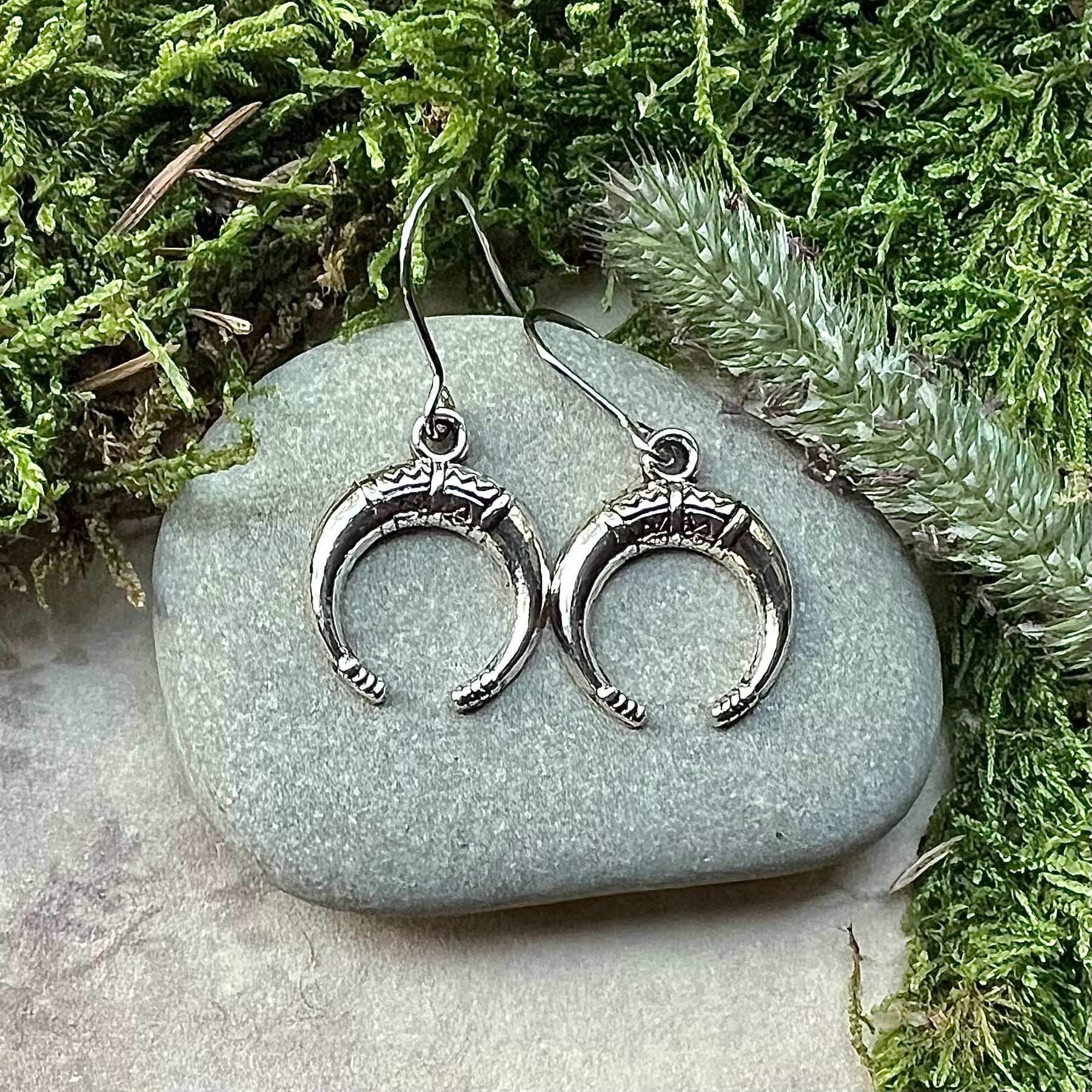Örhängen med horn i nickelfri metall och krokar av kirurgiskt stål.