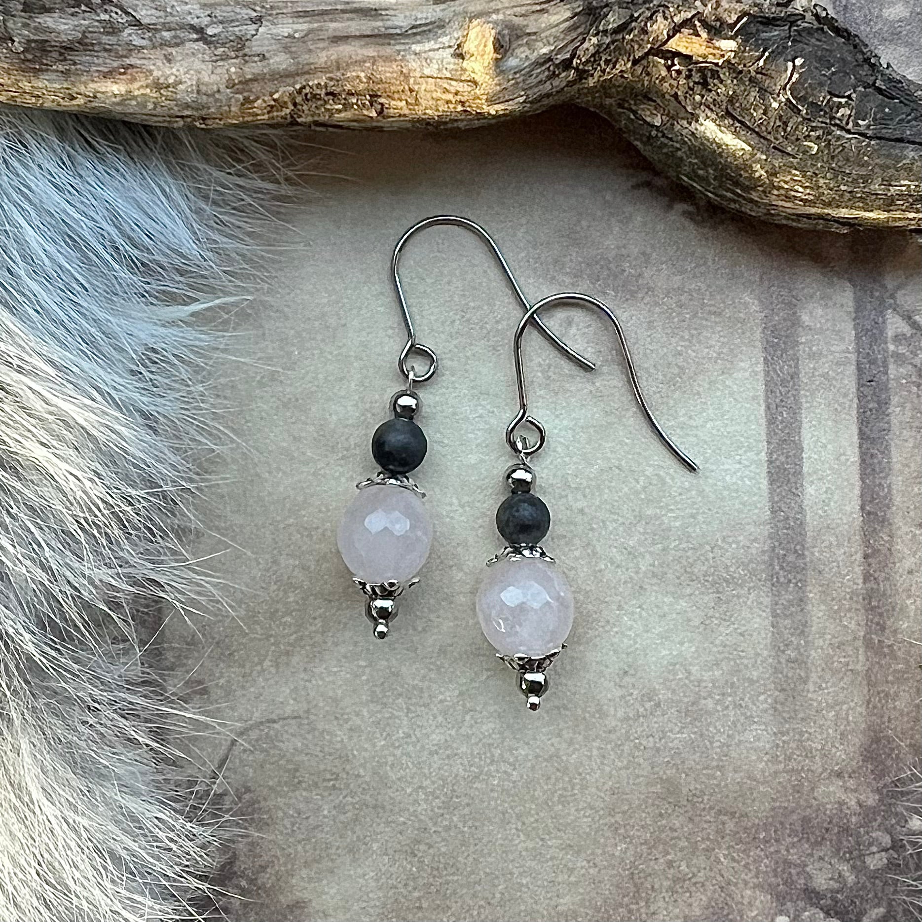 Örhängen av labradorit och fasettslipad rosenkvarts med krokar av kirurgiskt stål.
