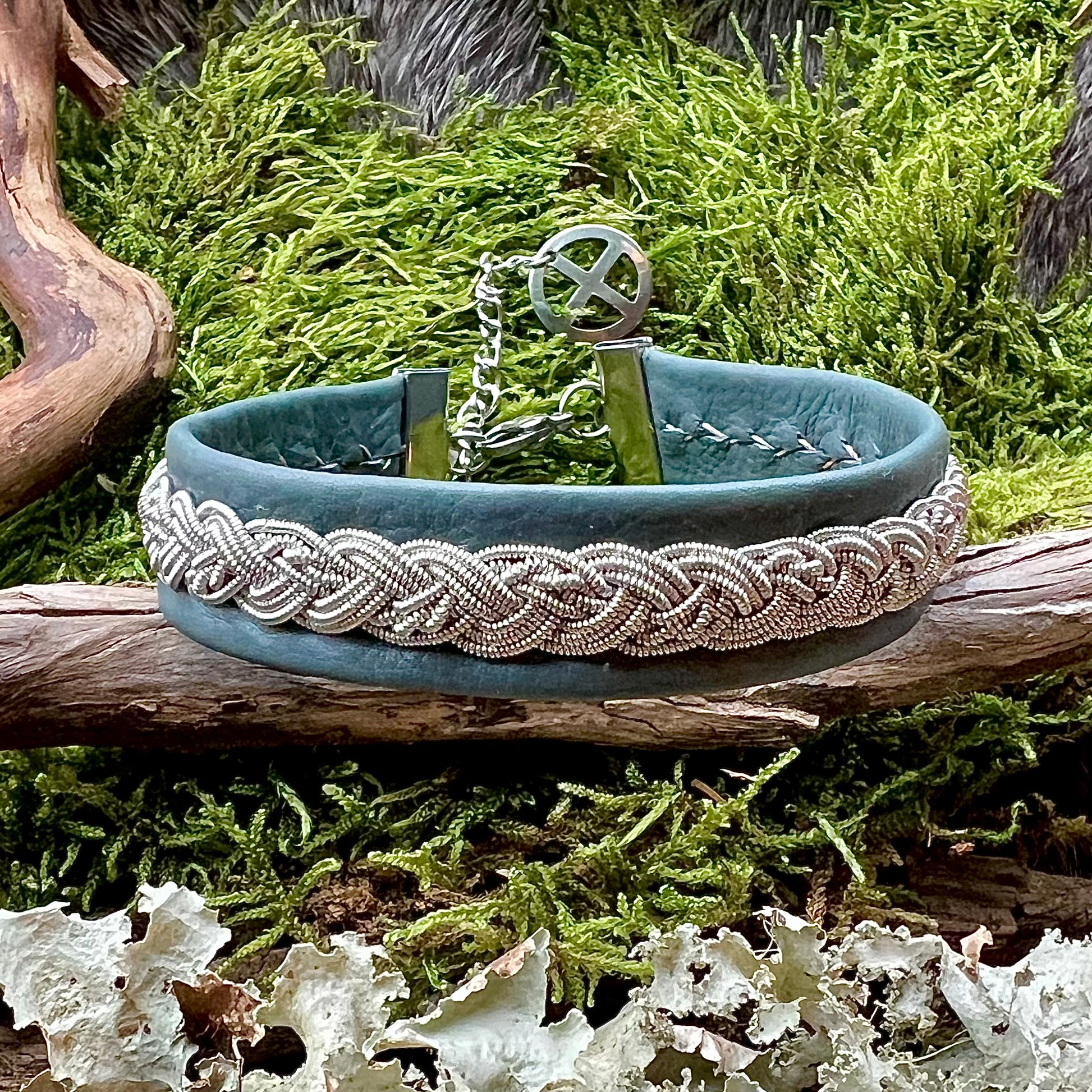 Armband av tätt spunnen tenntråd med 4% silver, flätat och sytt på mjukt renskinn. Vi använder oss inte av den traditionella renhornsknappen utan har valt spänne och lås av rostfritt stål med förlängningskedja som avslutas med ett solkors.