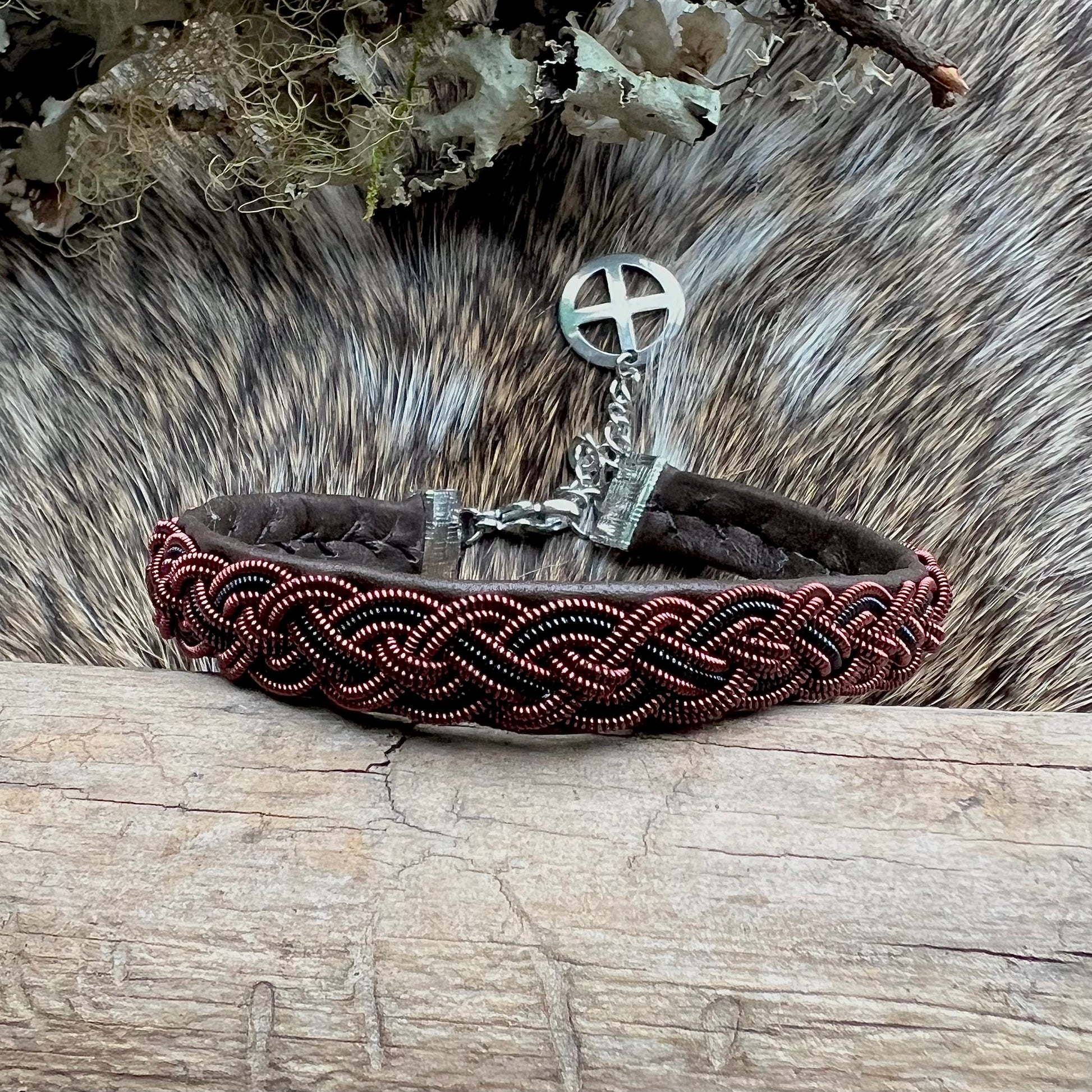 Armband av tätt spunnen tenntråd med 4% silver, flätat och sytt på mjukt renskinn. Vi använder oss inte av den traditionella renhornsknappen utan har valt spänne och lås av rostfritt stål med förlängningskedja som avslutas med ett solkors.