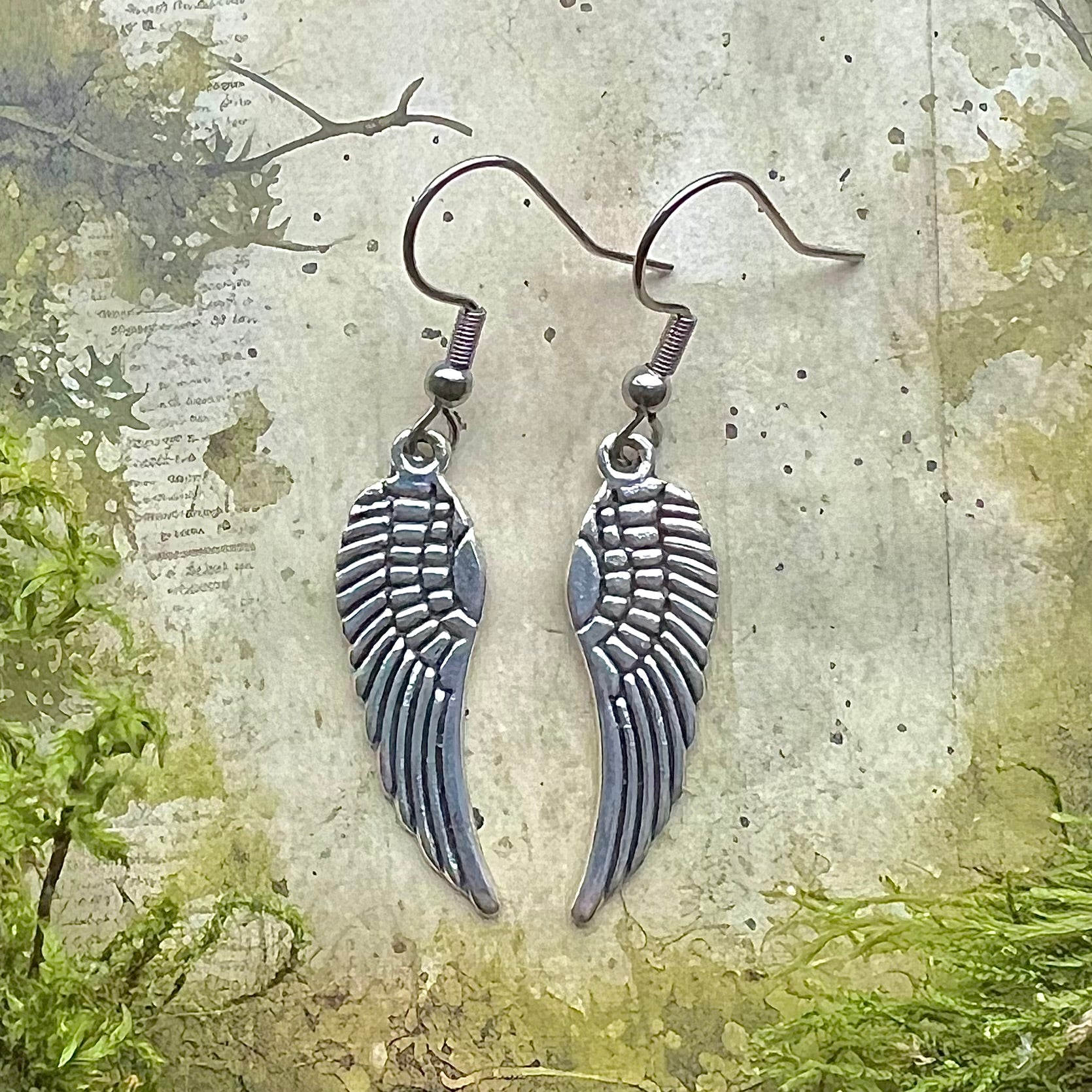 Örhängen med vingar av guldfärgad, nickelfri metall och krok av kirurgiskt stål.