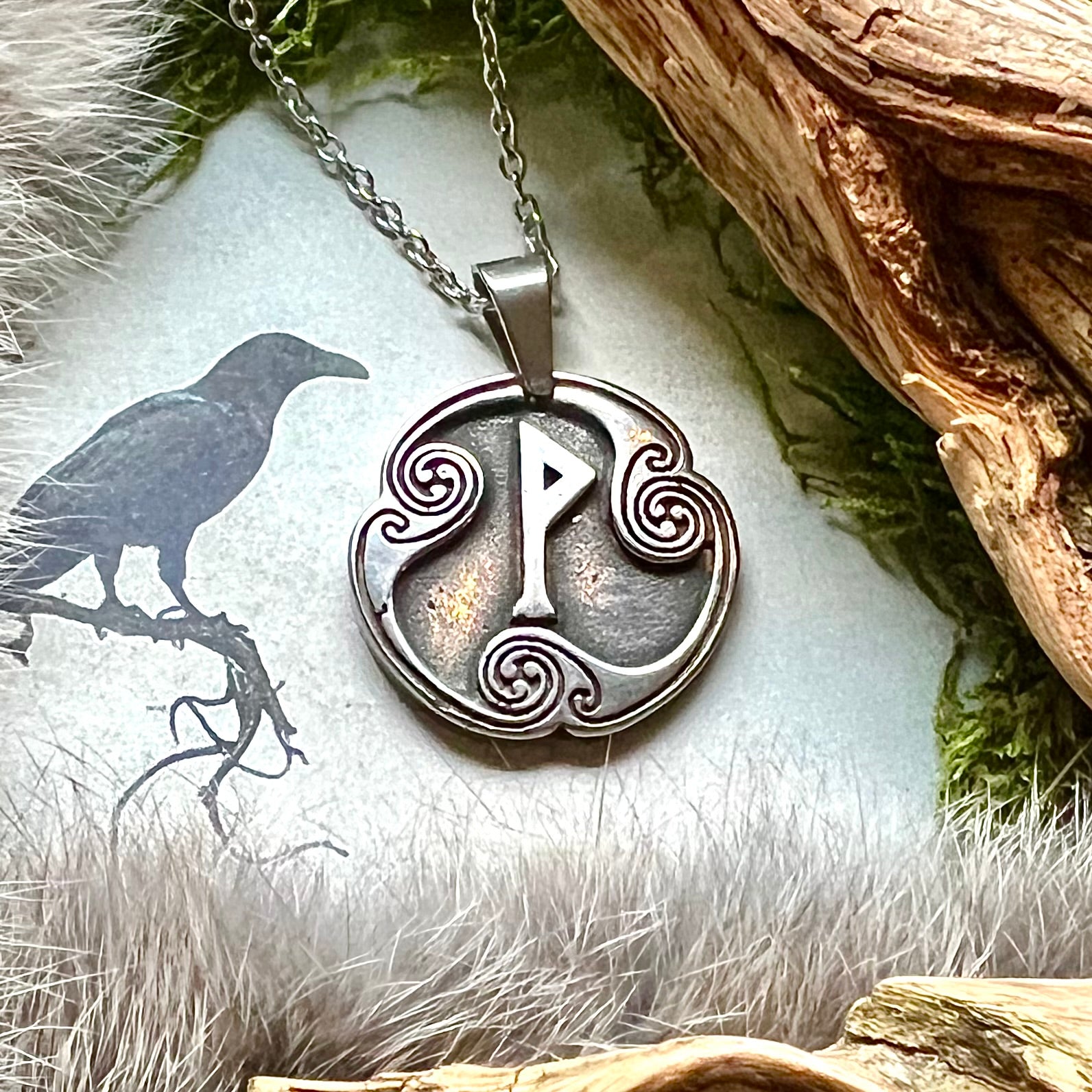 Vikingasmycke halsband helt i rostfritt stål med runa från den äldre futharken. Runalfabetet kallas futhark då namnet bildas av de sex första runorna i raden.