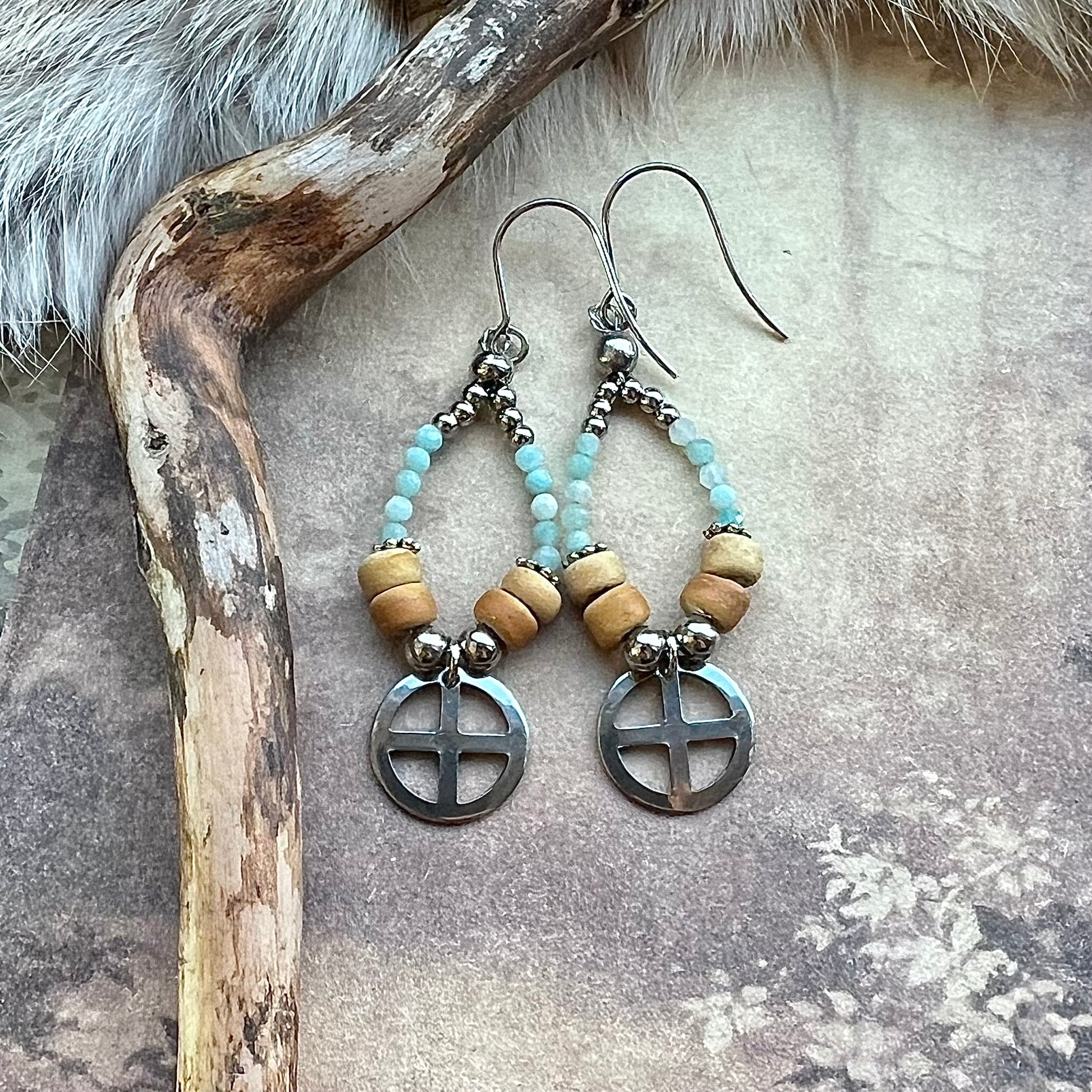 Droppformade örhängen med amazonit, pärlor av horn och solkors