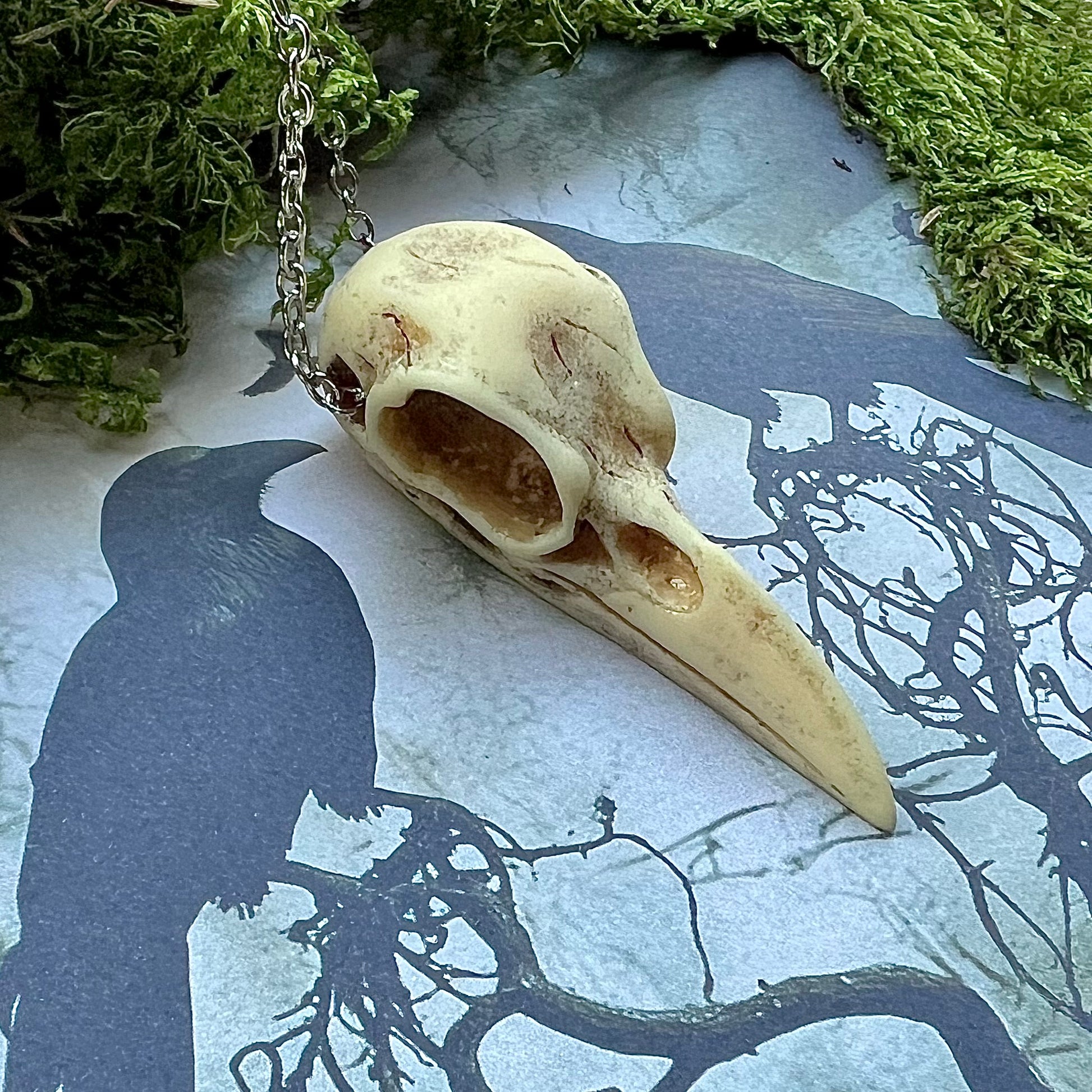 Stort korpkranium av benfärgad harts och kedja i rostfritt stål.