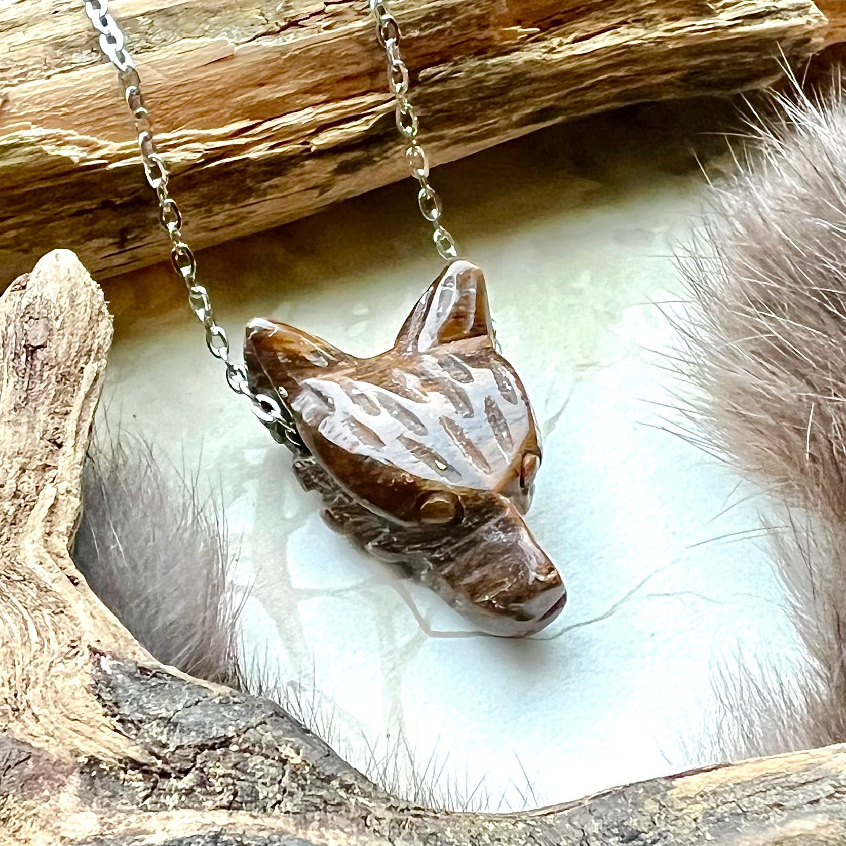 Kristallhalsband med varghuvud av tigeröga