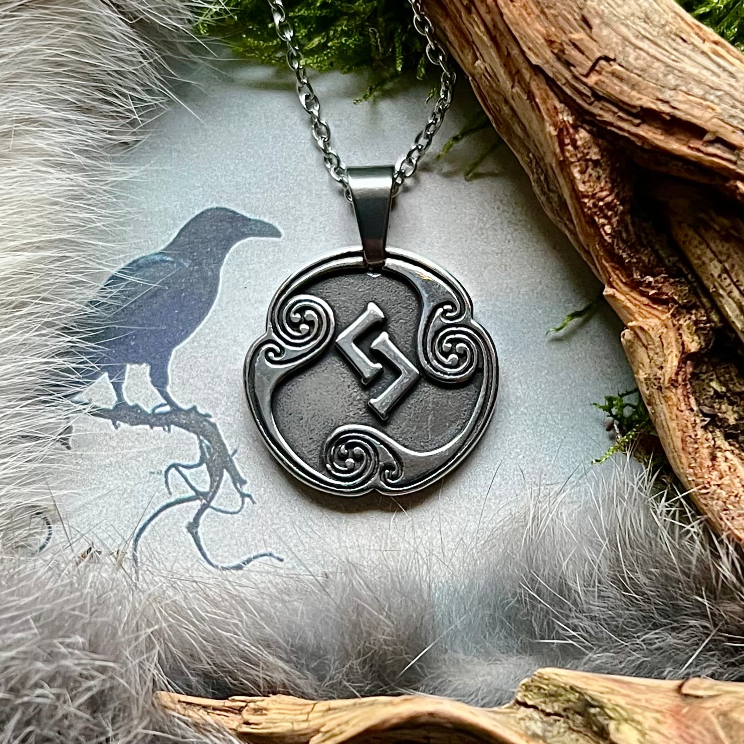 Vikingasmycke halsband helt i rostfritt stål med runa från den äldre futharken. Runalfabetet kallas futhark då namnet bildas av de sex första runorna i raden.
