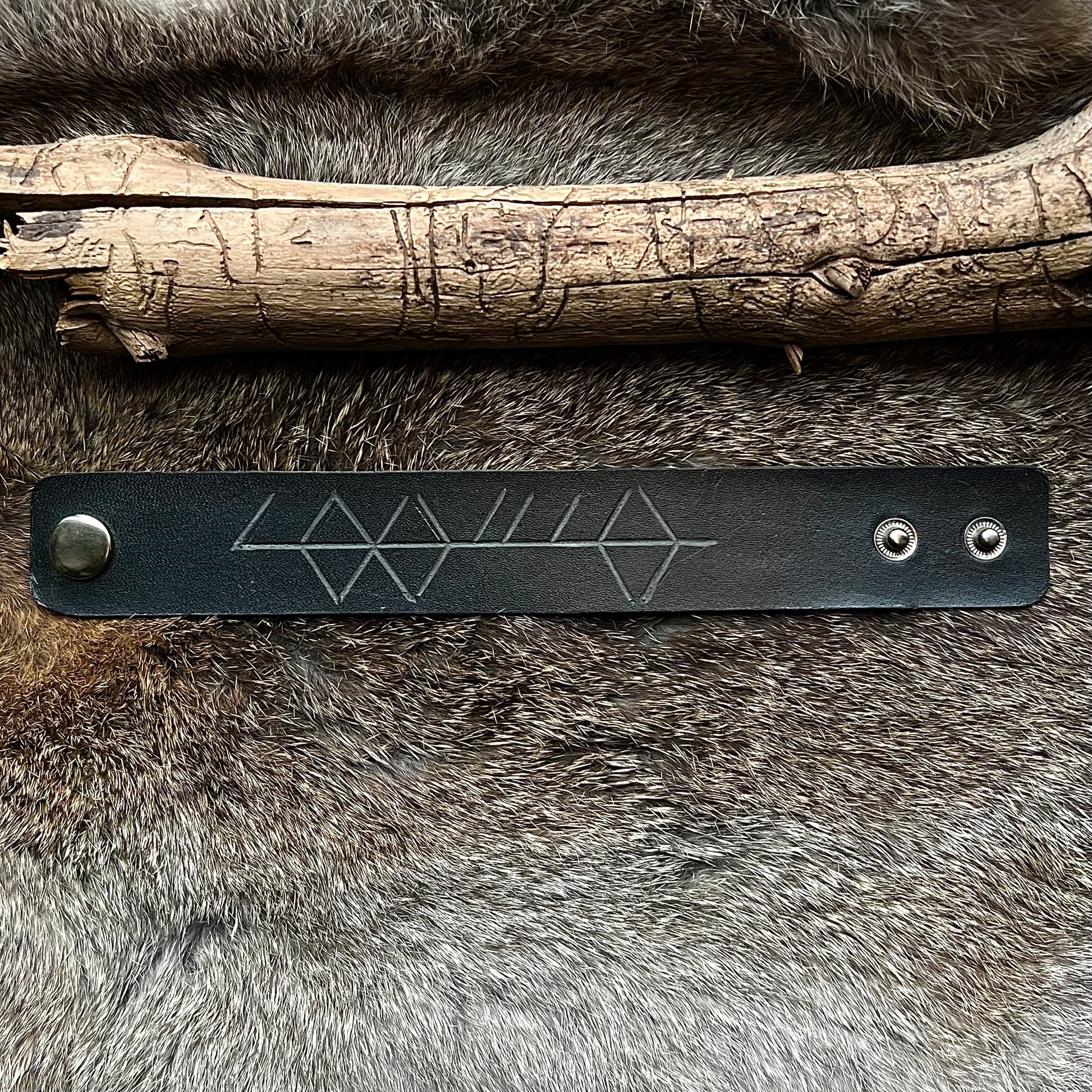 Armband i 4mm tjockt läder med nickelfria tryckknappar och handskurna runor.