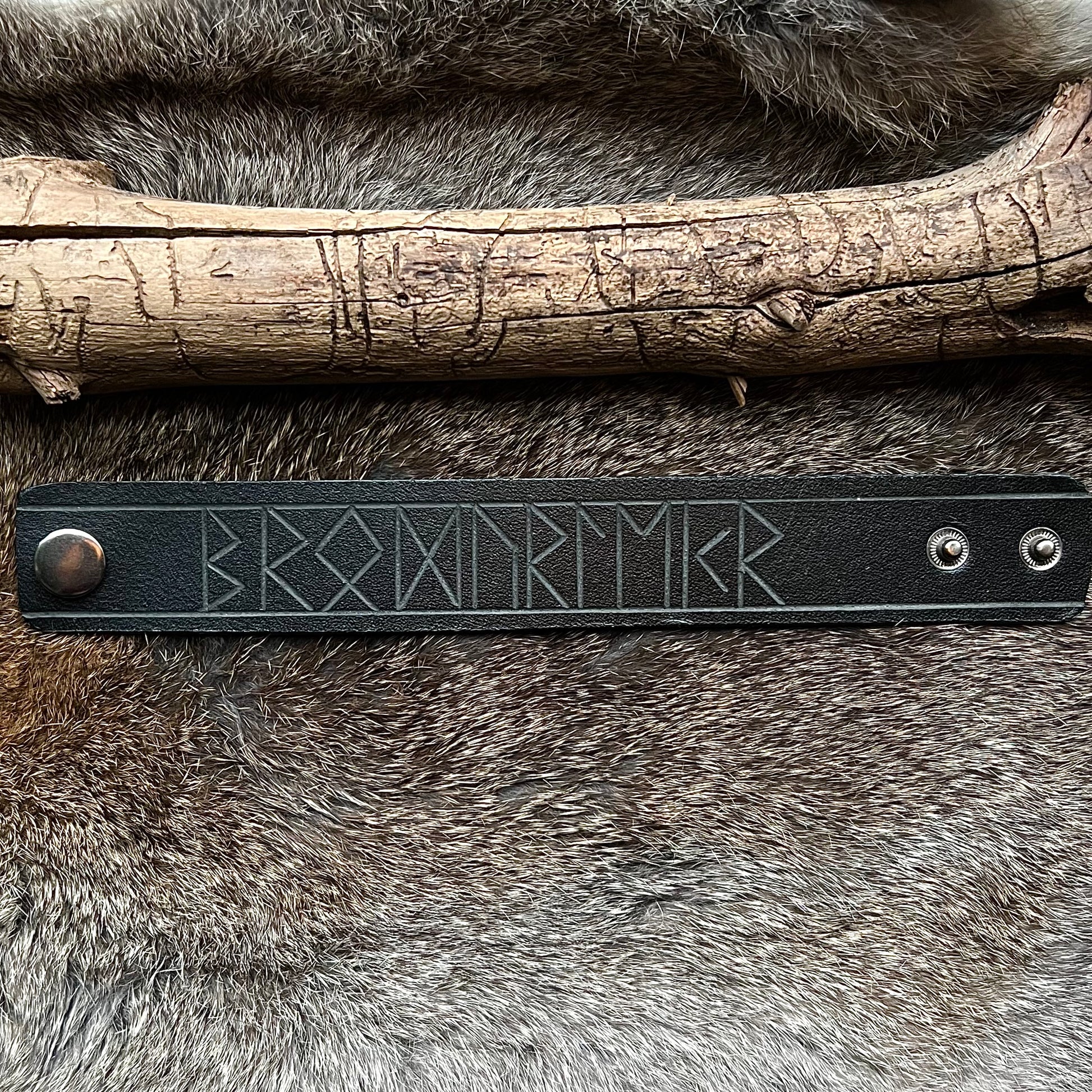 Armband i 4mm tjockt läder med nickelfria tryckknappar och handskurna runor.