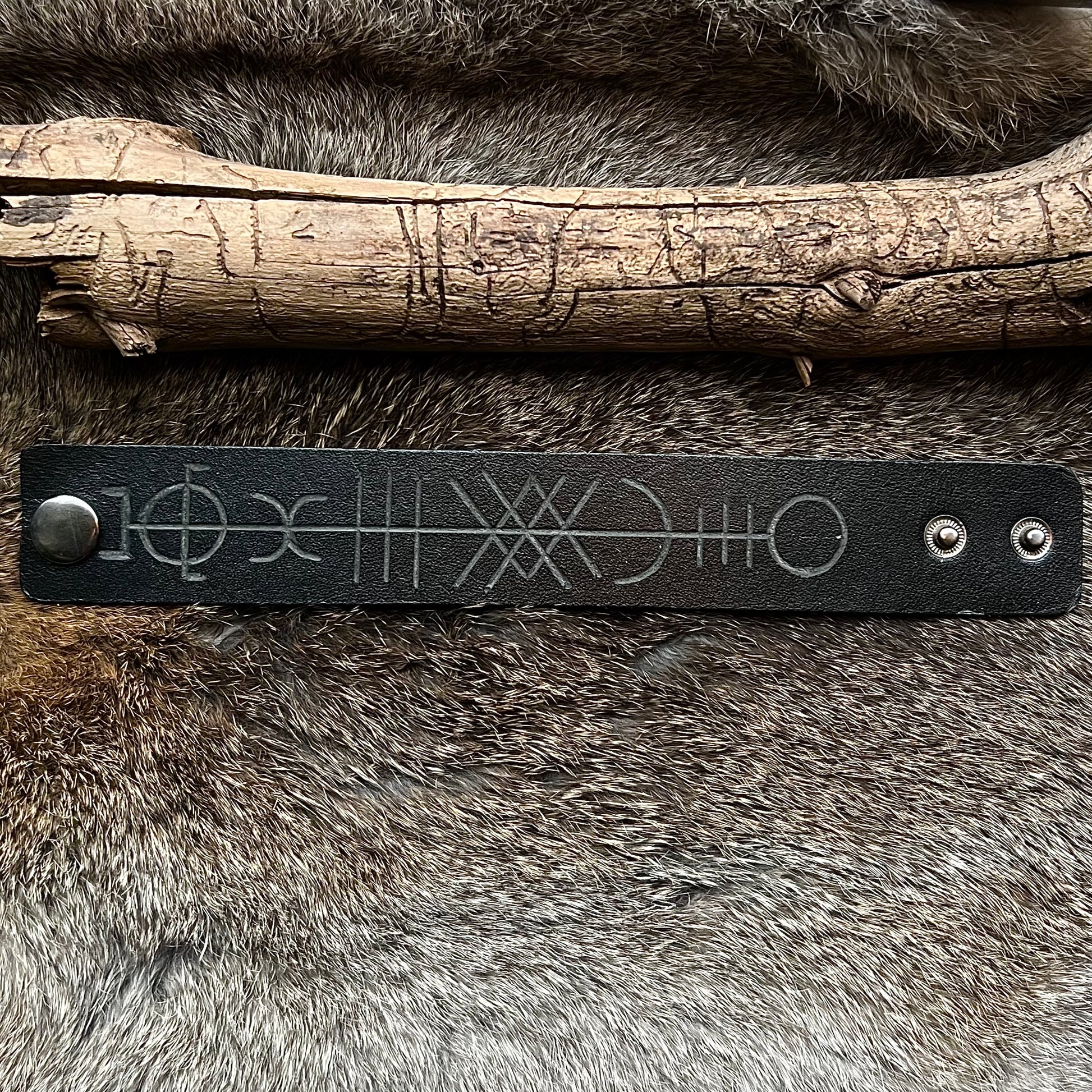 Armband i 4mm tjockt läder med nickelfria tryckknappar och handskurna runor.