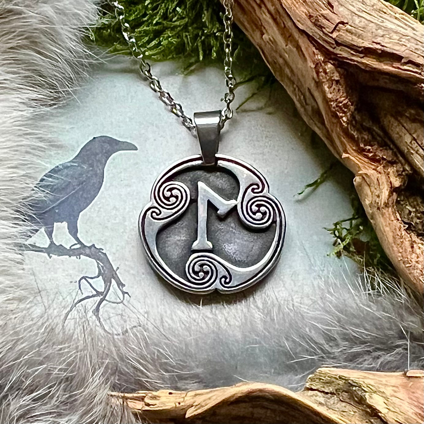 Vikingasmycke halsband helt i rostfritt stål med runa från den äldre futharken. Runalfabetet kallas futhark då namnet bildas av de sex första runorna i raden.