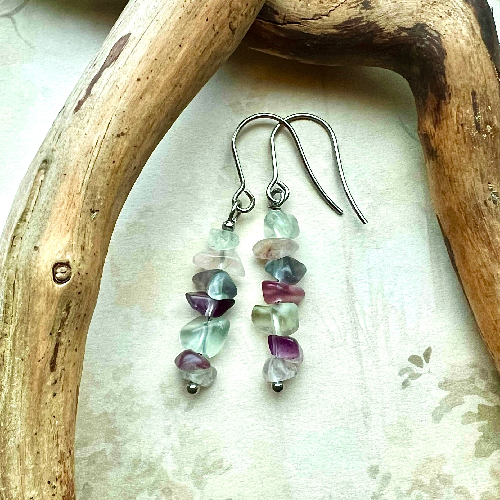 Örhängen med krok av kirurgiskt stål och pärlor av fluorit.