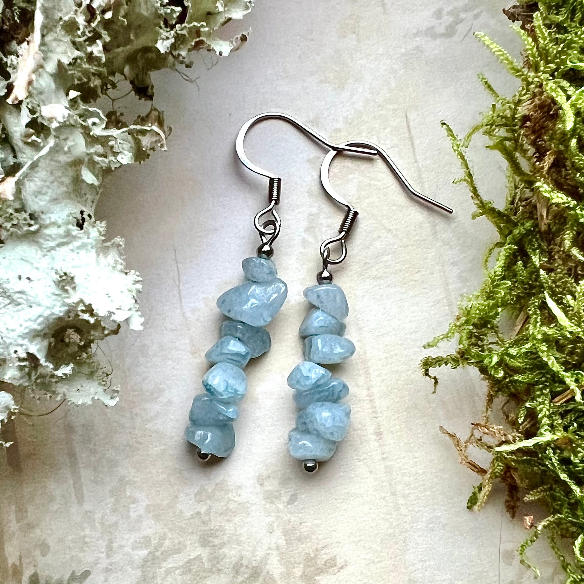 Örhängen med krok av kirurgiskt stål och pärlor av akvamarin.