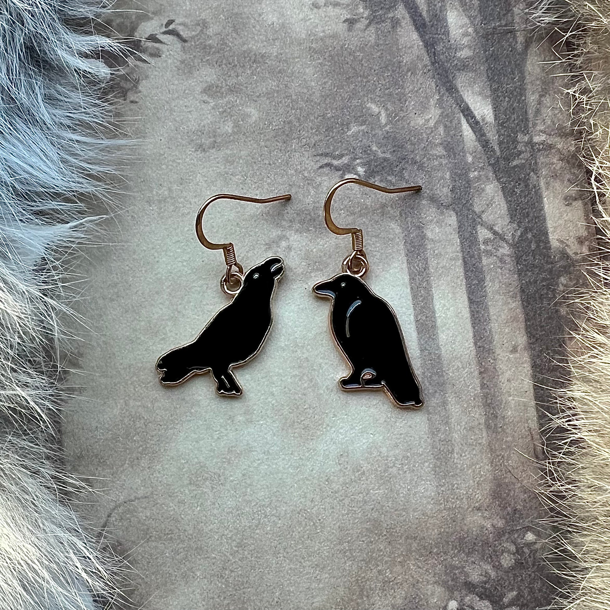 Örhängen med svarta, emaljerade korpar och krokar i kirurgiskt stål.