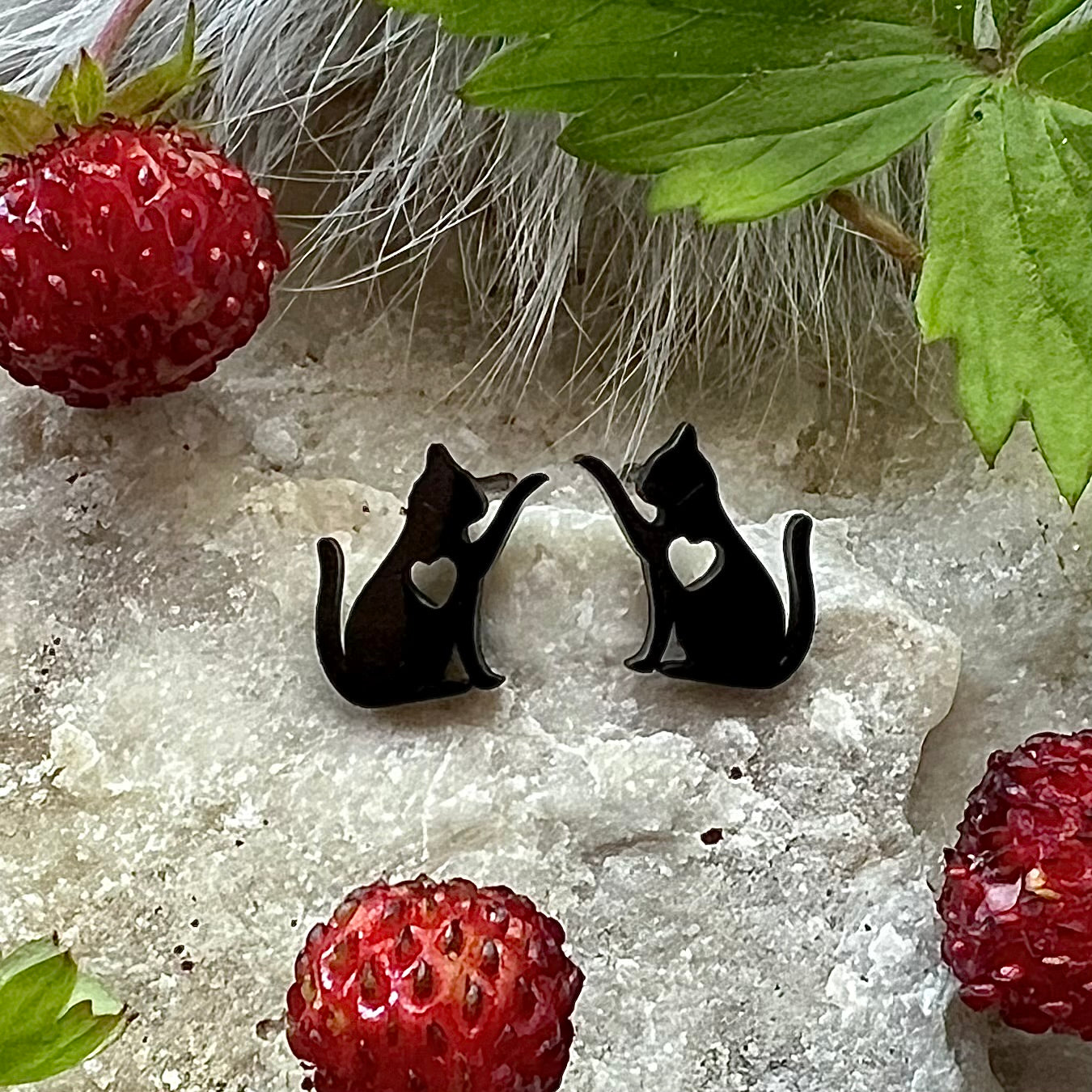 Små stiftörhängen av svart rostfritt stål med katter och hjärtan.