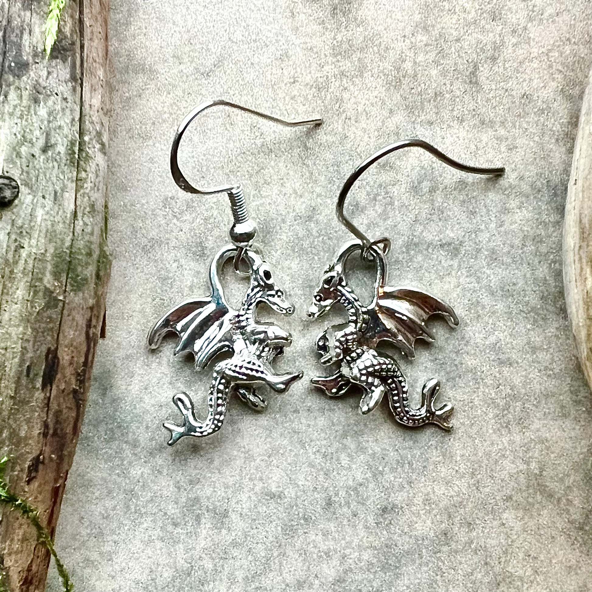 Örhängen med små detaljerade drakar i nickelfri metall. Krokar av kirurgiskt stål.
