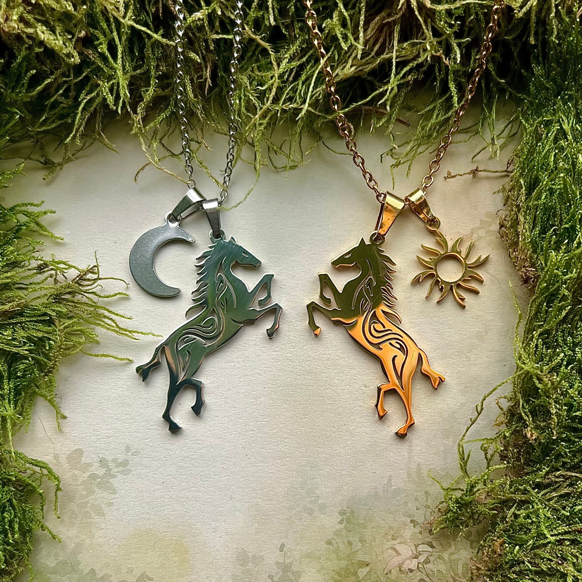 Halsband helt i rostfritt stål med hästar. Rimfaxe och måne i silver eller Guldfaxe och sol i guld