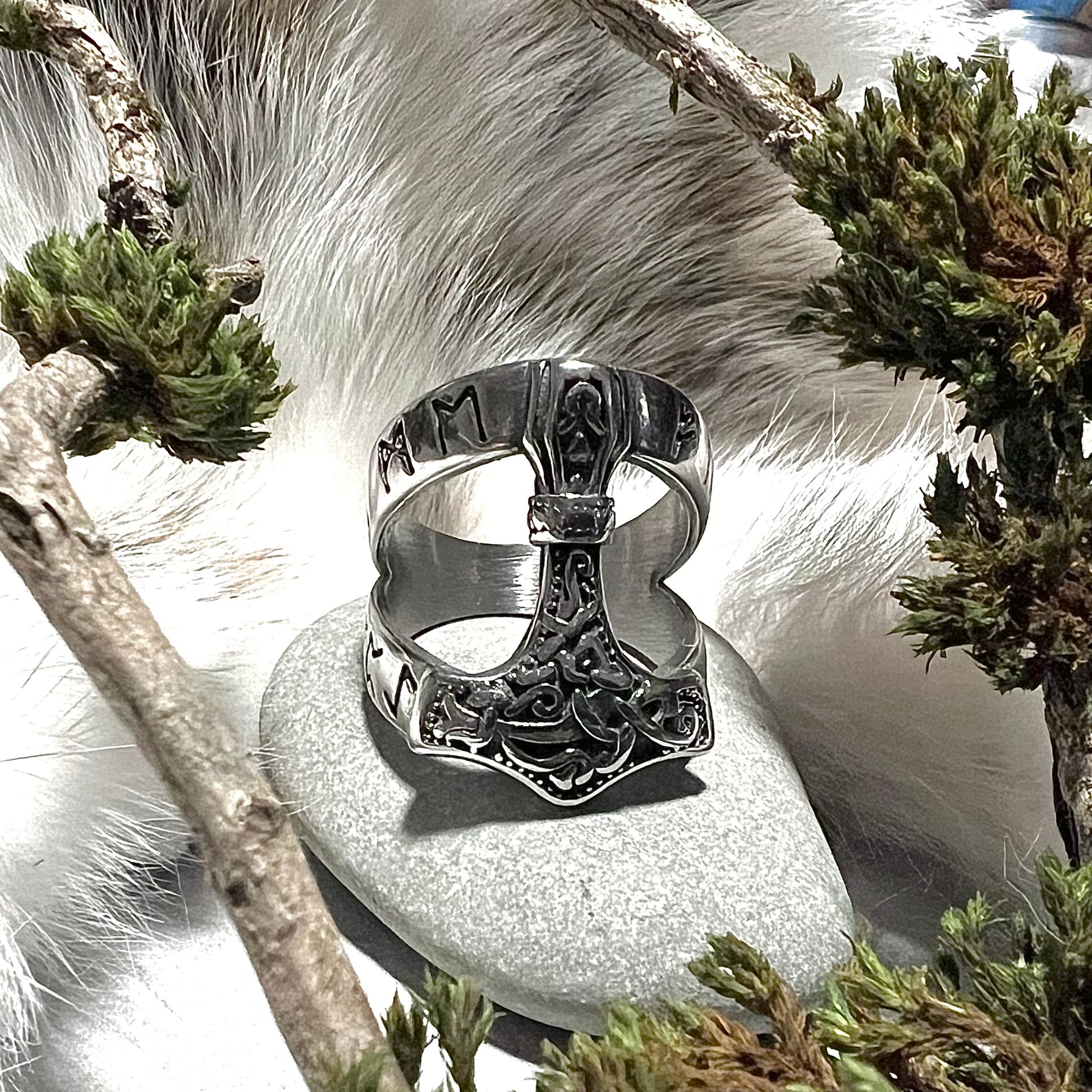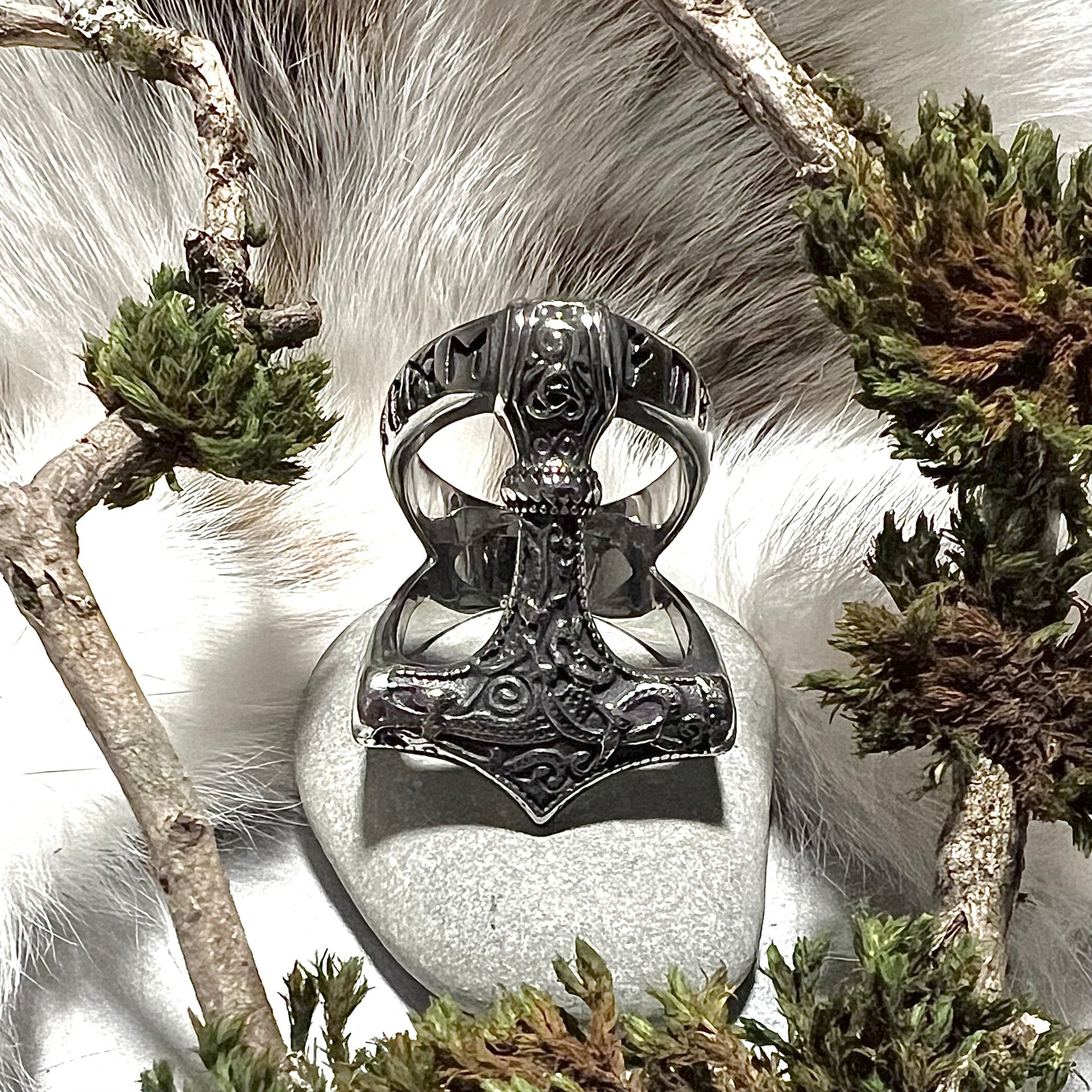 Ring i rostfritt stål med runförsedda band och stor detaljerad torshammare.