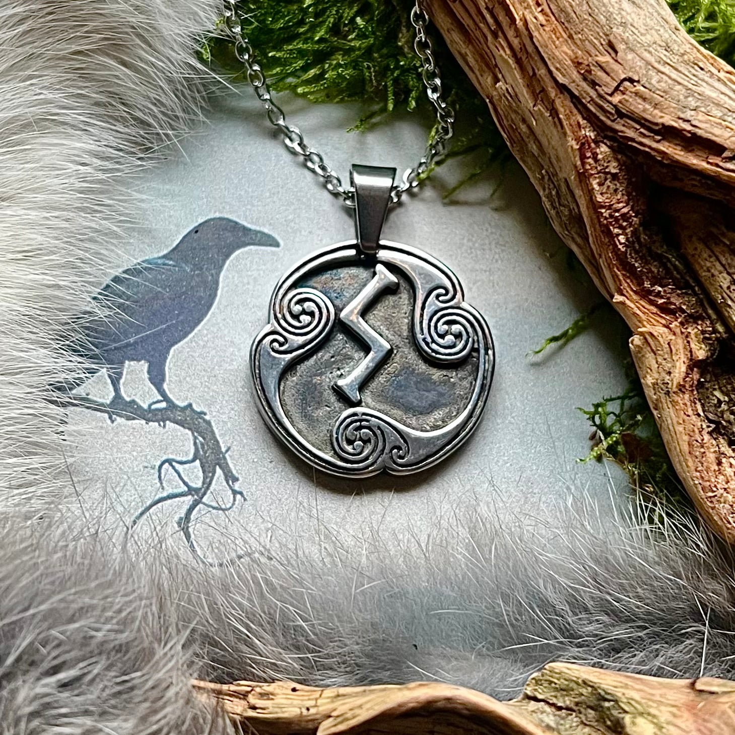 Vikingasmycke halsband helt i rostfritt stål med runa från den äldre futharken. Runalfabetet kallas futhark då namnet bildas av de sex första runorna i raden.