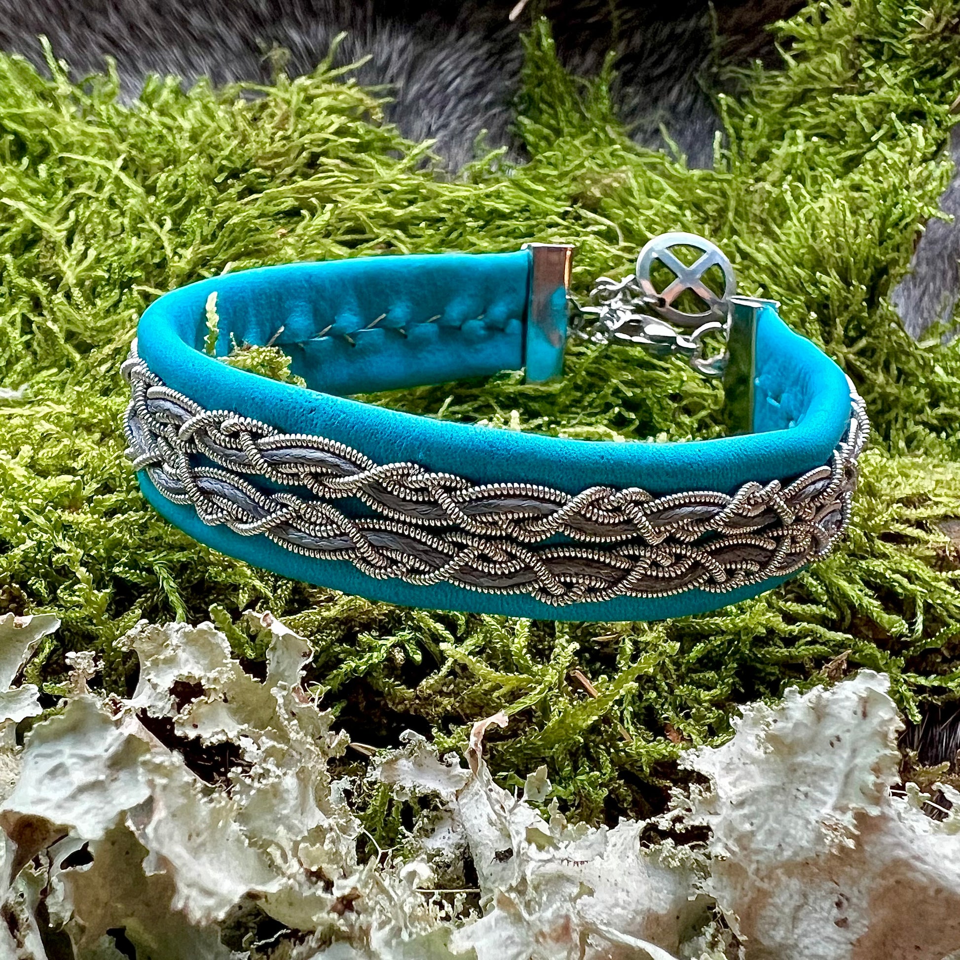 Fläta med grått band på turkost skinn.