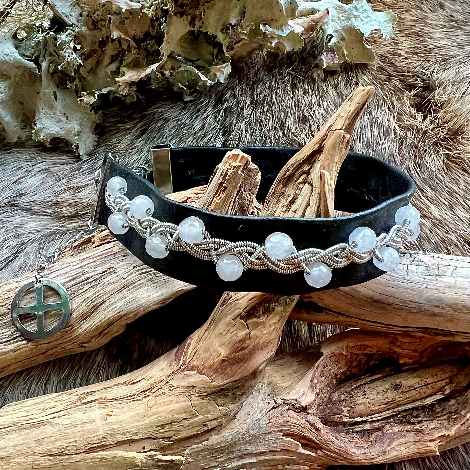 Armband av tätt spunnen tenntråd med 4% silver, flätat och sytt på mjukt renskinn. Vi använder oss inte av den traditionella renhornsknappen utan har valt spänne och lås av rostfritt stål med förlängningskedja som avslutas med ett solkors.