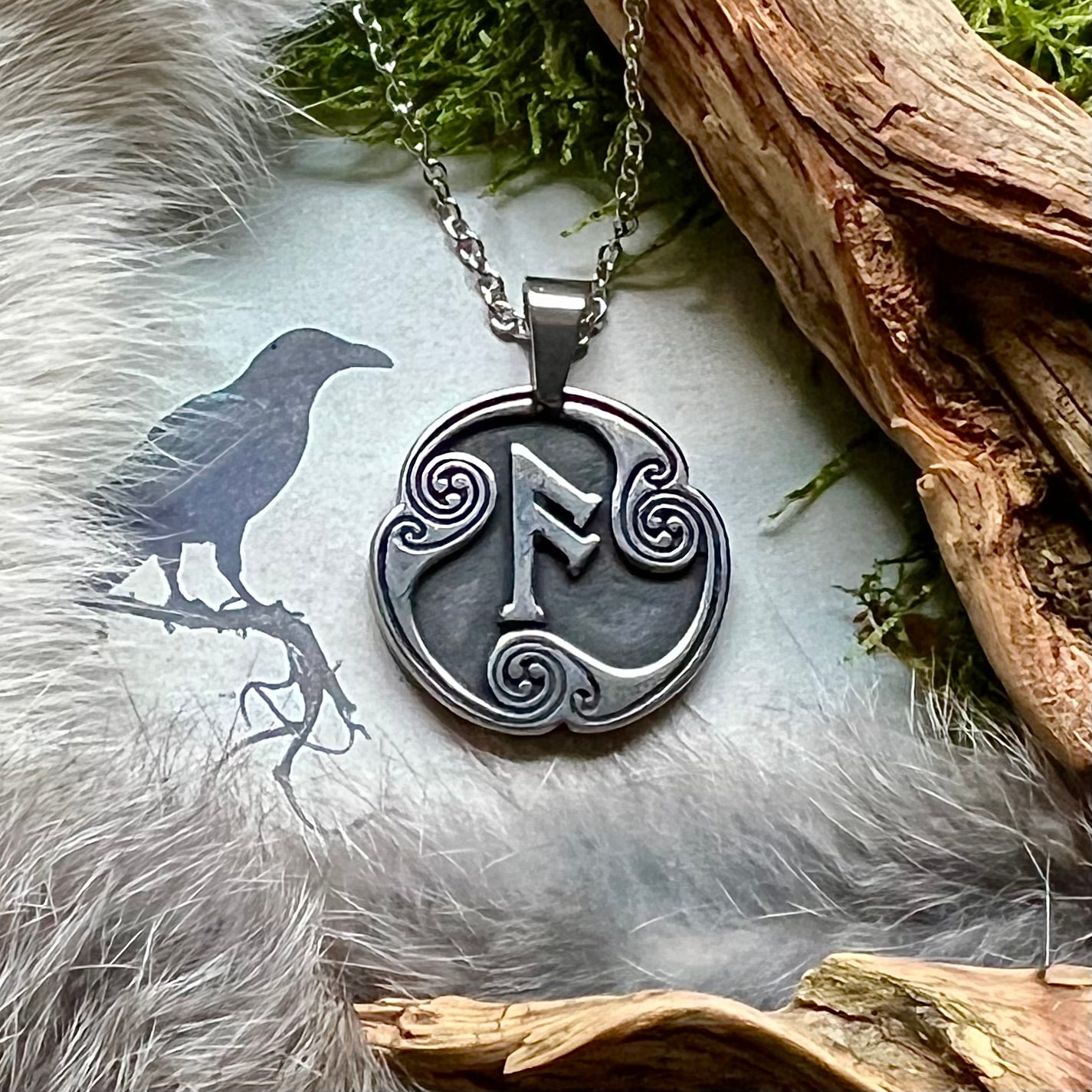 Vikingasmycke halsband helt i rostfritt stål med runa från den äldre futharken. Runalfabetet kallas futhark då namnet bildas av de sex första runorna i raden.